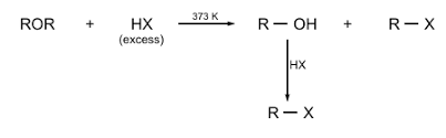 - C-O Bond Cleavage: Ethers can react with hydrogen halides (HX) to cleave the C-O bond, producing alkyl halides and alcohols. The reactivity order is HI > HBr > HCl. Example: R−O−R′ + HX → R−X + R′−OH
